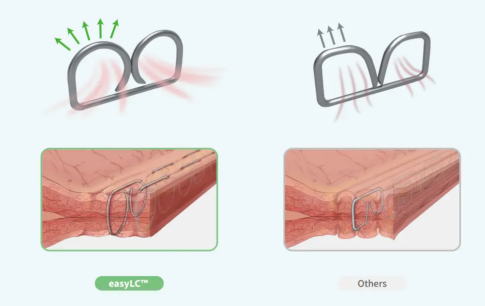 El easyLC™ ofrece tres niveles de fuerza de sujeción, lo que lo hace adecuado para diferentes tipos de tejido. Esta característica facilita la hemostasia y previene la necrosis tisular.