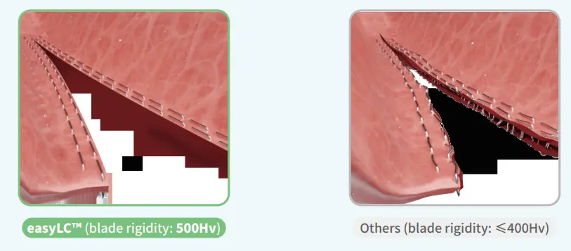 La hoja de acero inoxidable de easyLC™ es al menos un 20 % más dura que la de productos comparables, lo que ayuda a lograr un corte más suave y preciso, reduciendo el sangrado causado por desgarros.